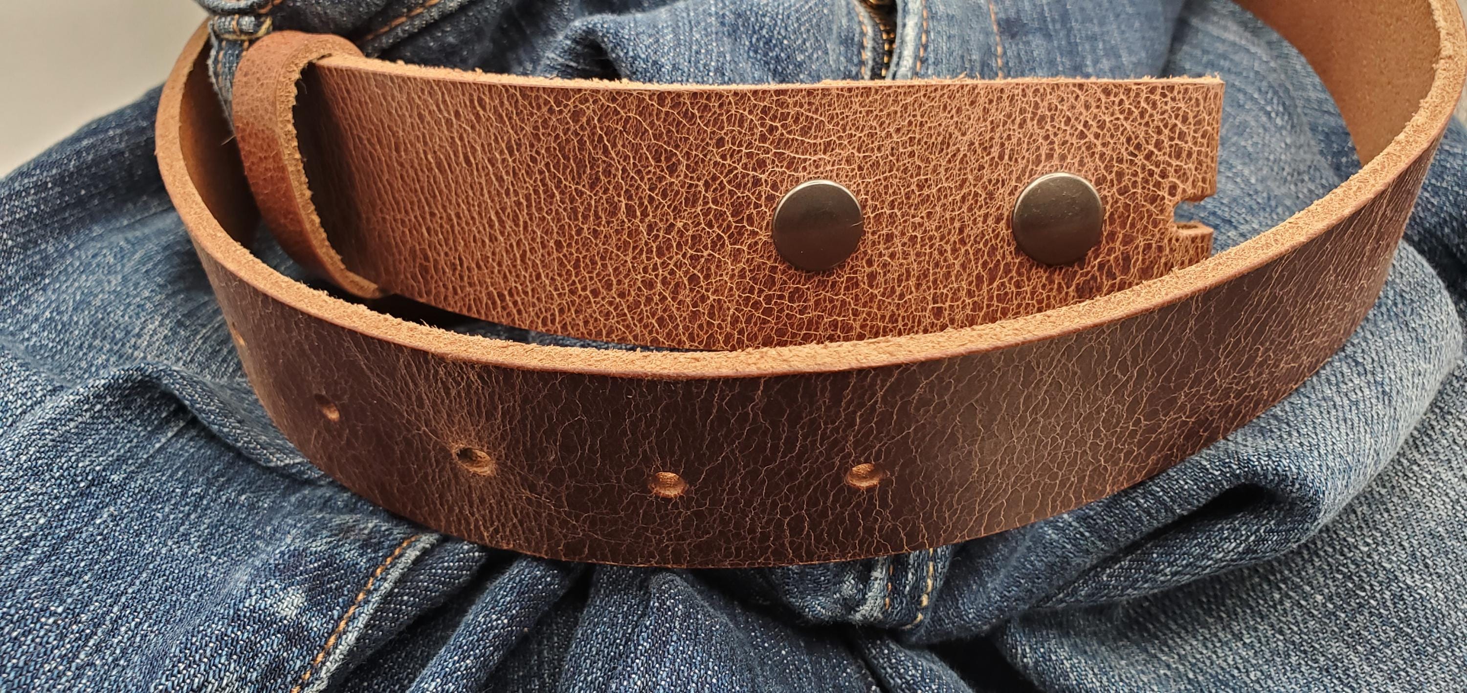Interchangeable custom cut leather belts w/snaps 1.5" and 1.25" wide custom sizes.