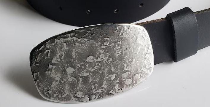 Textured stainless steel fits 1.5" belt for blue jeans.