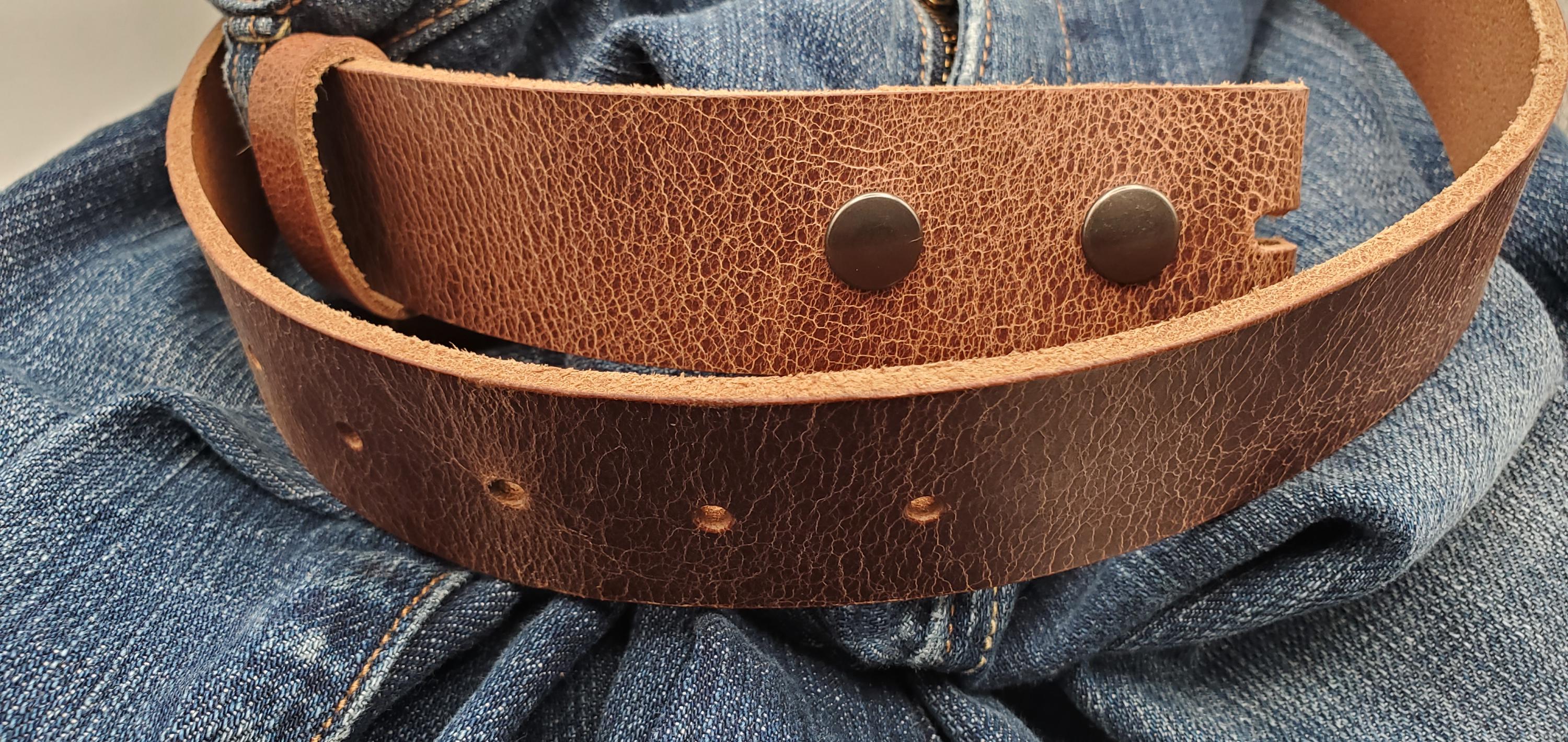 Custom cut leather belts with snaps 1-1/2" wide (jeans & chinos) and 1-1/4"wide(suits)